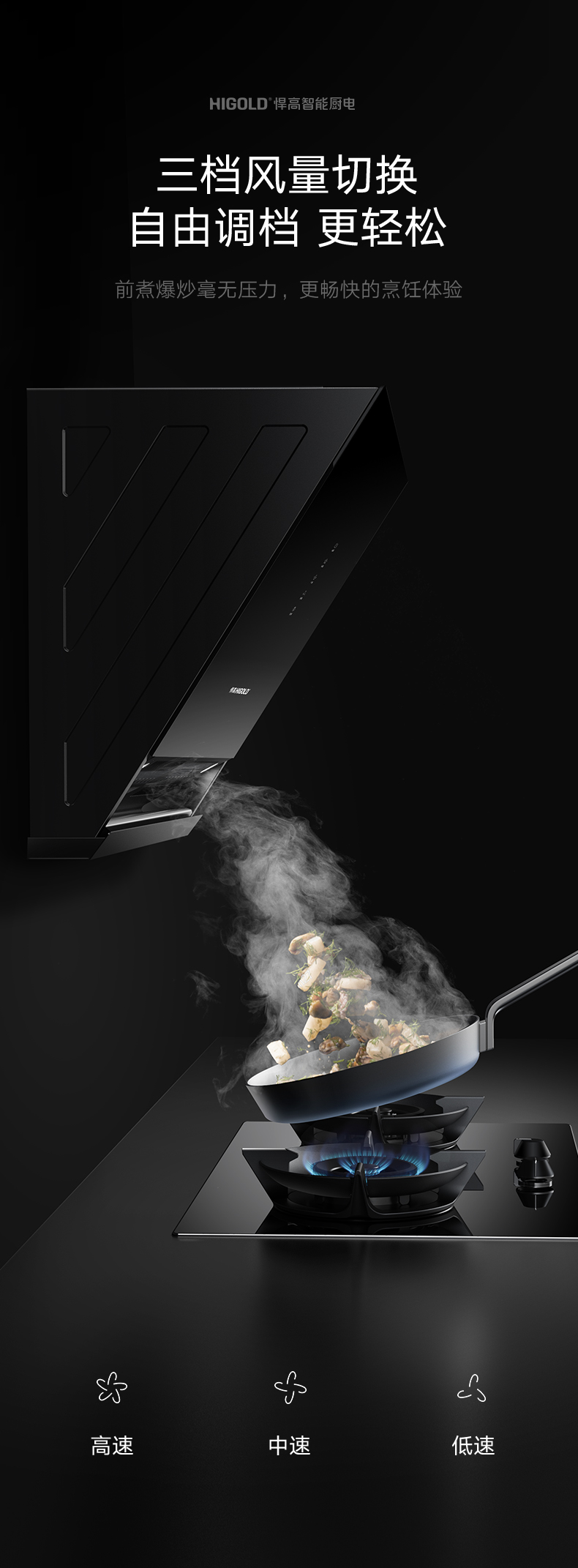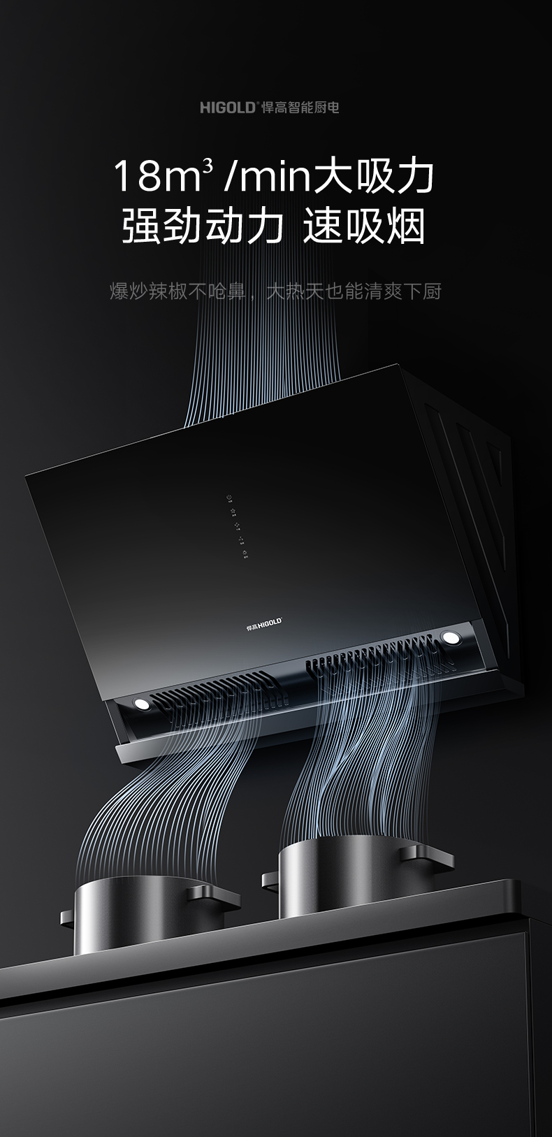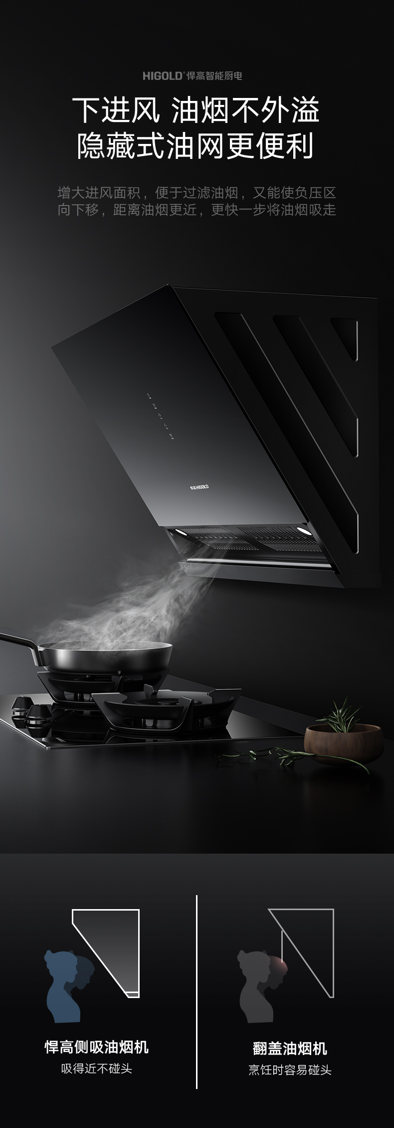 ▪ 侧吸式下进风,油烟不外溢,烹饪更随心,