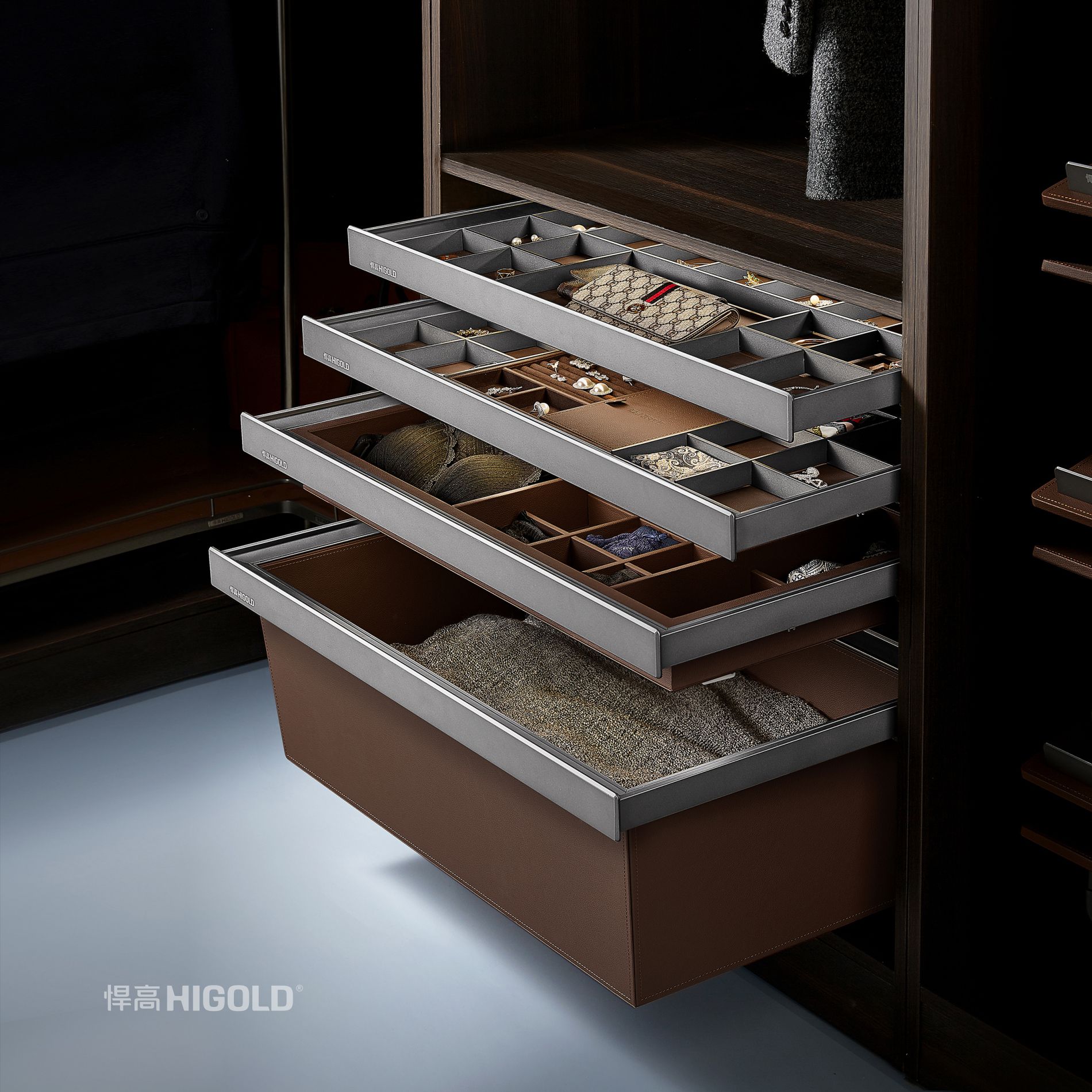 设计:贴心分区设计,让饰物一目了然,拿取方便;跑车工艺皮革,带来超舒适的触摸质感;塑料件全隐藏式设计,框架设计简洁大气;原创大R设计,保护饰物免刮花。魔术贴设计,便捷安装,左右微调,打破柜体限制。