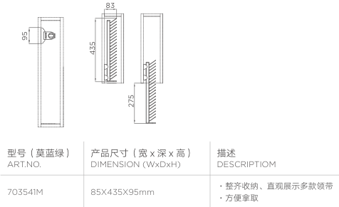 悬挂式收纳,避免邹巴巴出行;多款样式直观可见,方便上班出门前搭配。