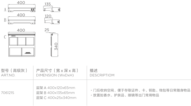 • 层架建议收纳香水、护肤品、润肤品、针线盒等工具物品