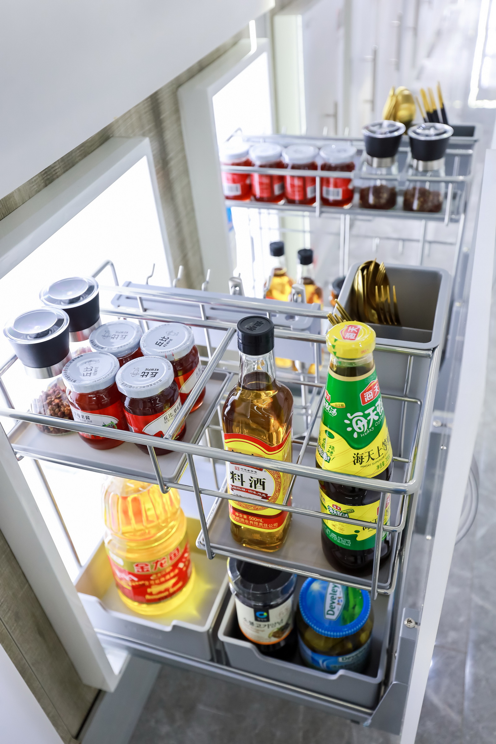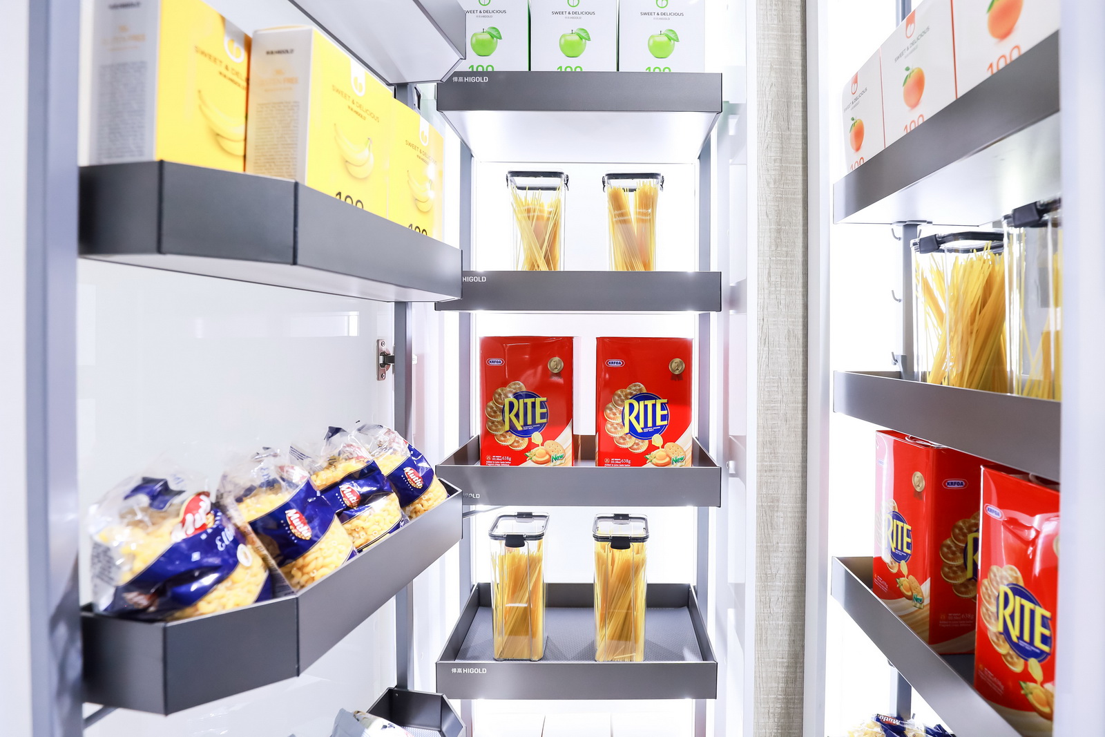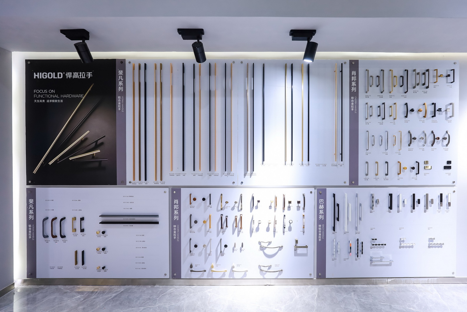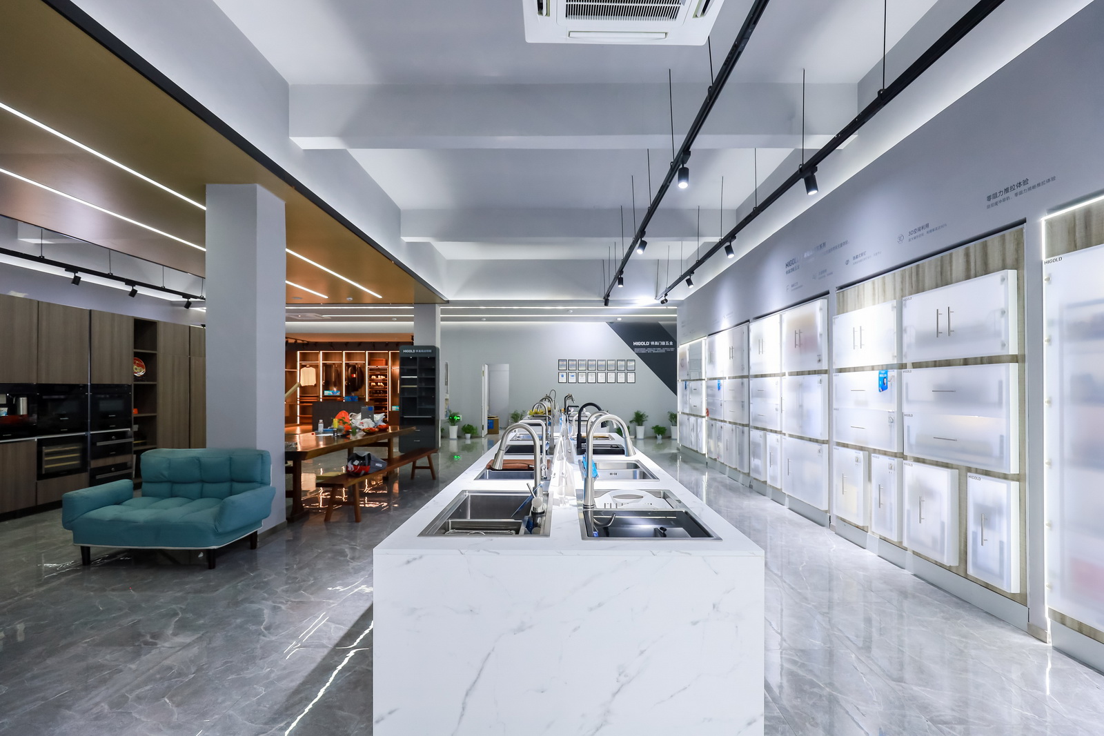 杭州旗舰店展厅空间规划分为厨房功能五金、衣柜功能五金、基础五金、水槽龙头、智能厨电、装饰五金等区域,并上样悍高全系列明星产品,令消费者可以在优雅简约的门店氛围中体验一站式的全屋五金产品定制体验,减少消费者在家居五金选品时走的弯路。
