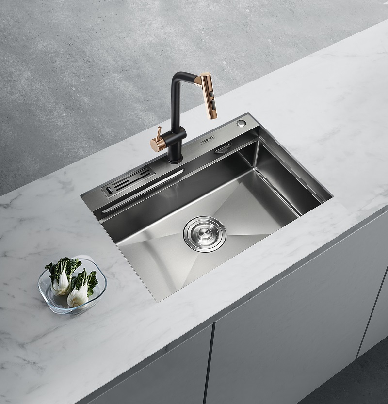 NN系列水槽组合套装槽体采用环保黑钛纳米工艺覆上薄膜,水滴在薄膜上立成球体,自由滚动带走污迹。油污酱汁一冲即净,水过无痕,轻松自洁。
