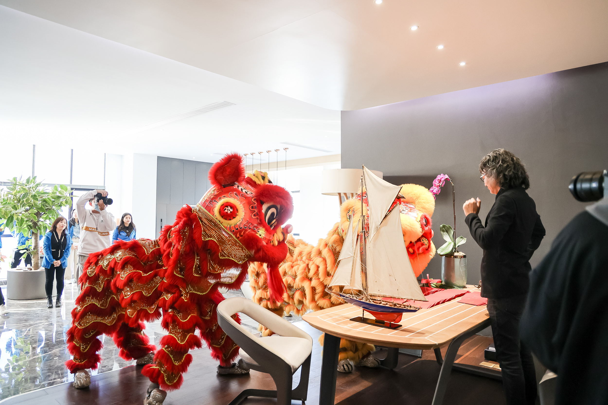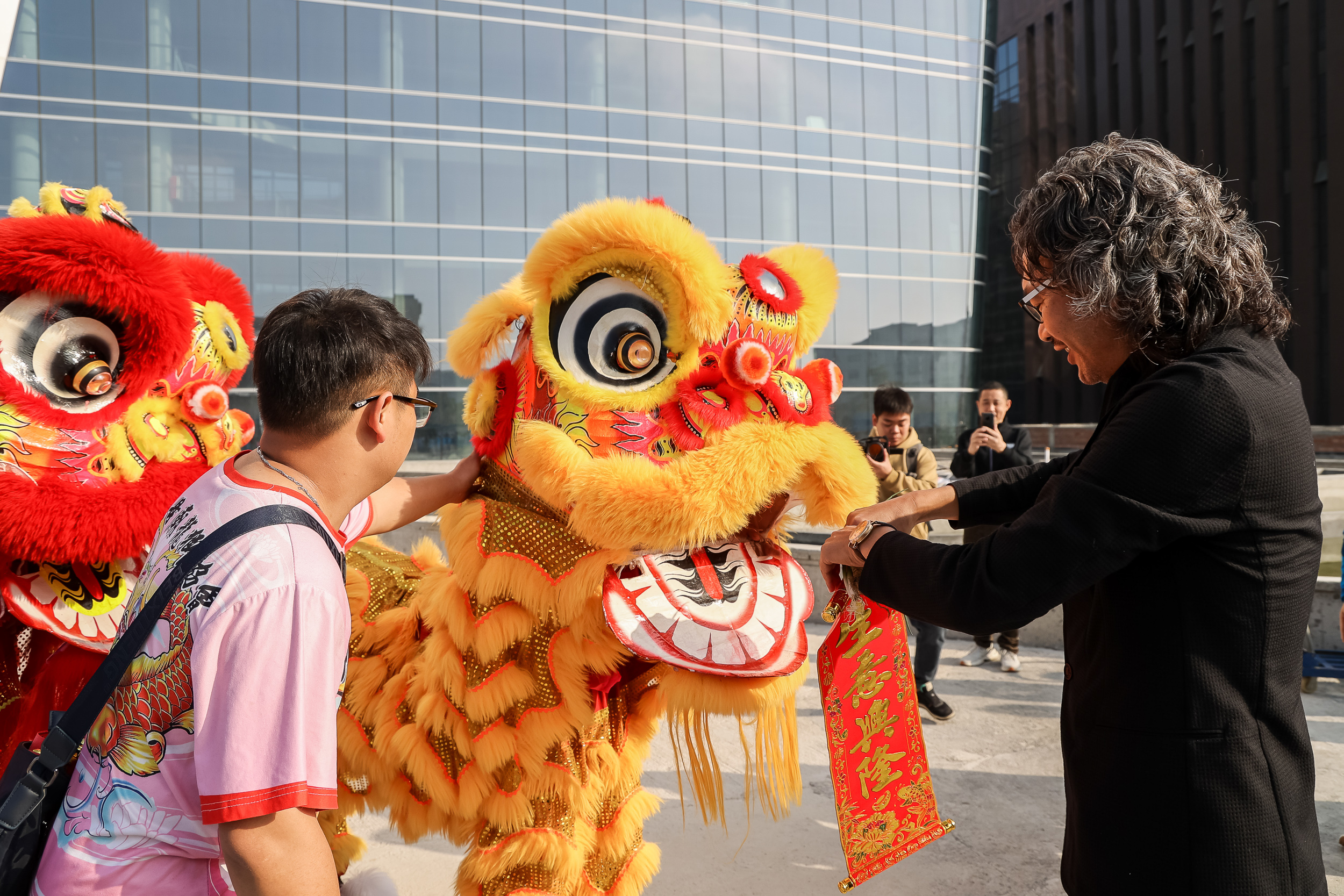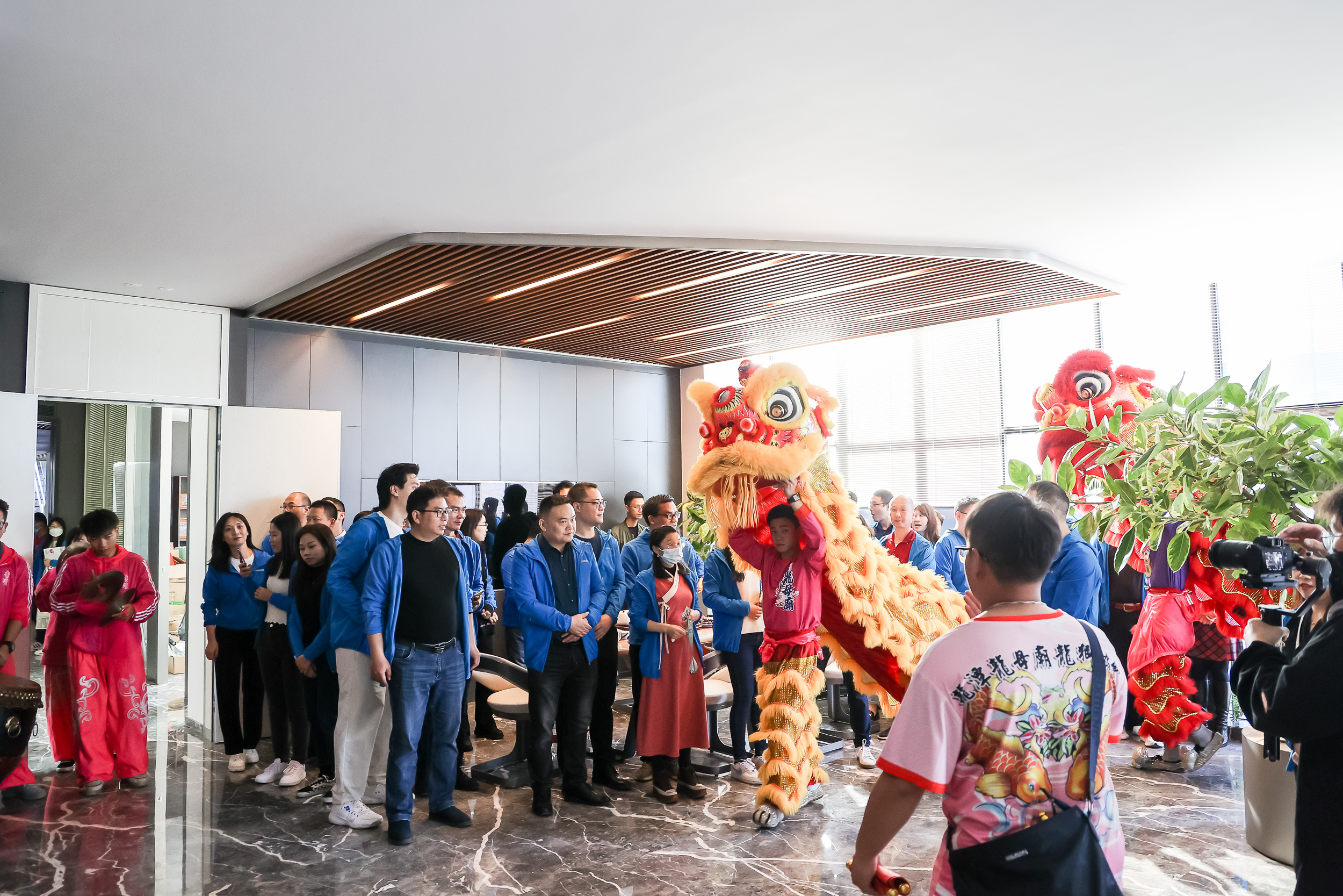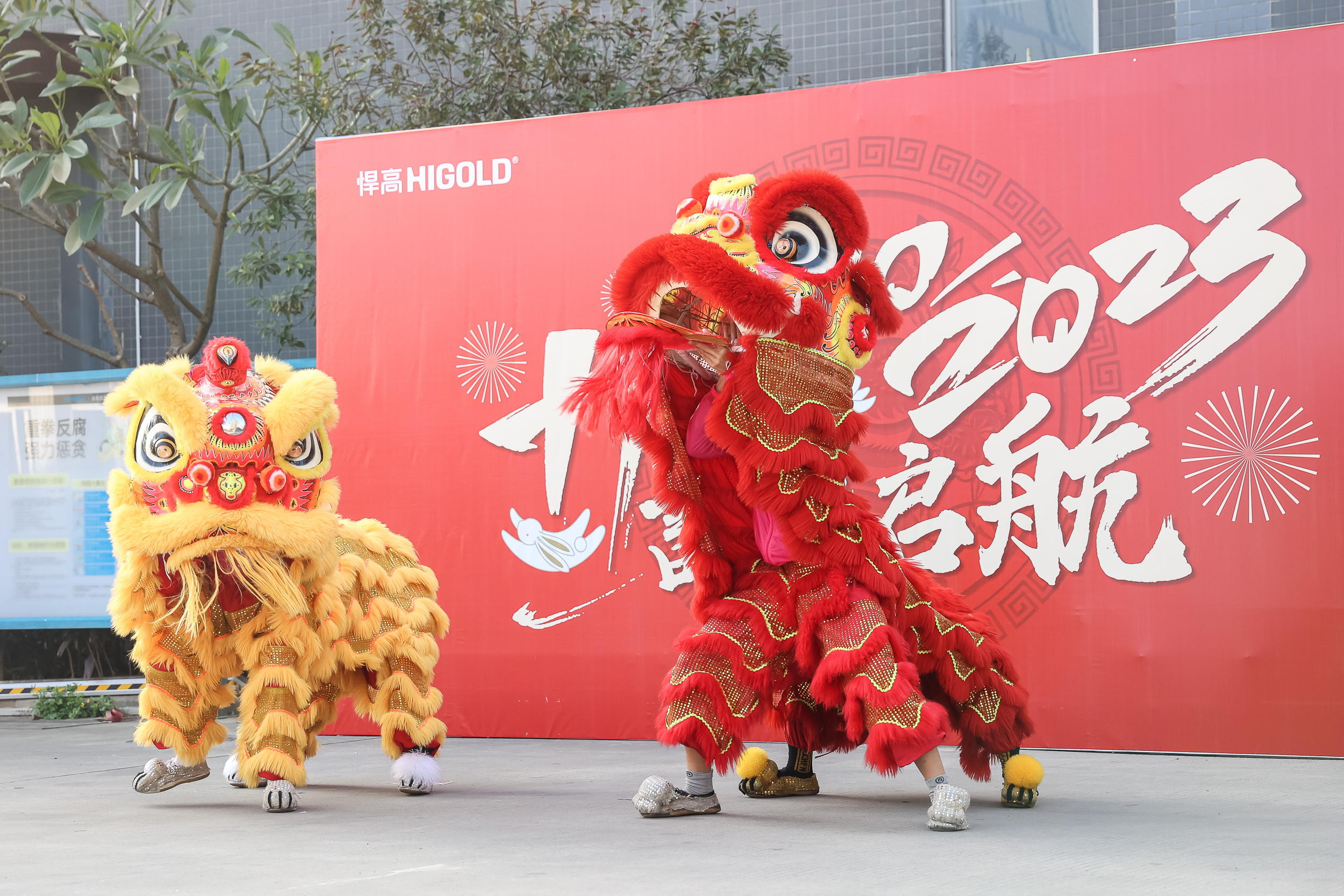 “金鼓一响黄金万两、金狮点睛富贵繁荣”。吉时到,鞭炮鸣、锣鼓响,雄狮闻声昂头,龙腾生风、翻腾跳跃,进行采青、献瑞,向悍高高层和一众员工献上吉祥如意,象征悍高新的一年生财利市、财运亨通、兴旺发达。