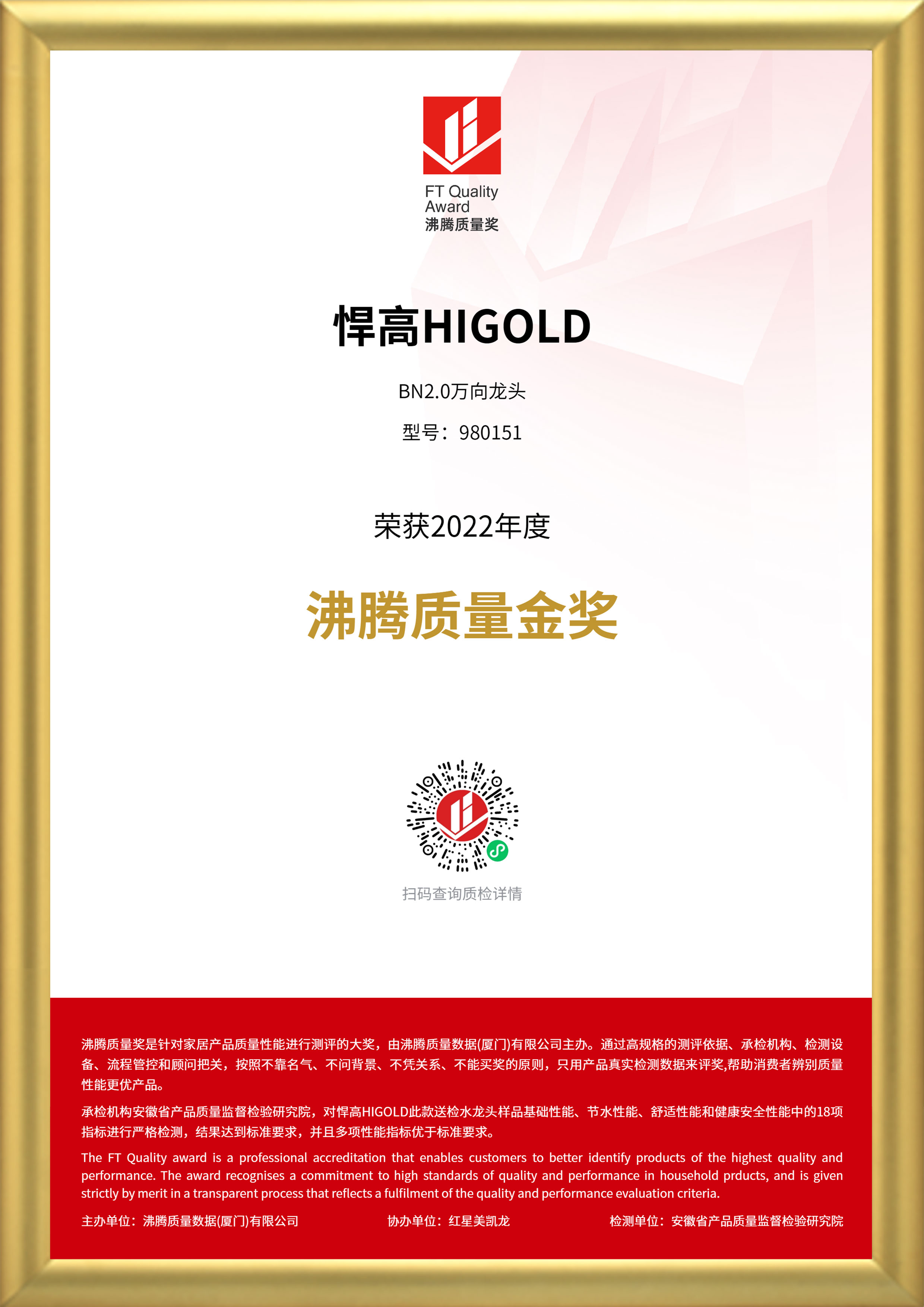 “沸腾质量奖”是针对家居产品质量性能进行测评的大奖。通过聚焦消费痛点,以高规格的测评依据、承检机构、检测设备、流程管控和顾问把关,秉持客观、严谨、公正的态度和“精工品质 用数据说话”的宗旨,筛选质量性能更优的家居好产品。其中,“沸腾质量金奖”是沸腾质量奖测评中的重磅奖项,代表了该品类当前质量风向标。