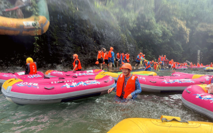 午饭过后,一场暴雨多少让人担忧下午的行程。结果到了古龙峡,雨停了,天也渐渐放晴,大家已穿好装备,踌躇满志地欲来一段激流勇进的痛快。雨后的水流更猛更急,靠在岸边连说话都需要使劲拉高嗓门。大家两两一船,在激流中奔腾,在尖叫声中前进,每一段激流猛冲都会带来恐惧,只有勇猛与强大,坚定地直面恐惧,以一往无前的气魄和勇气穿过滔滔水浪,才能到达成功的彼岸。