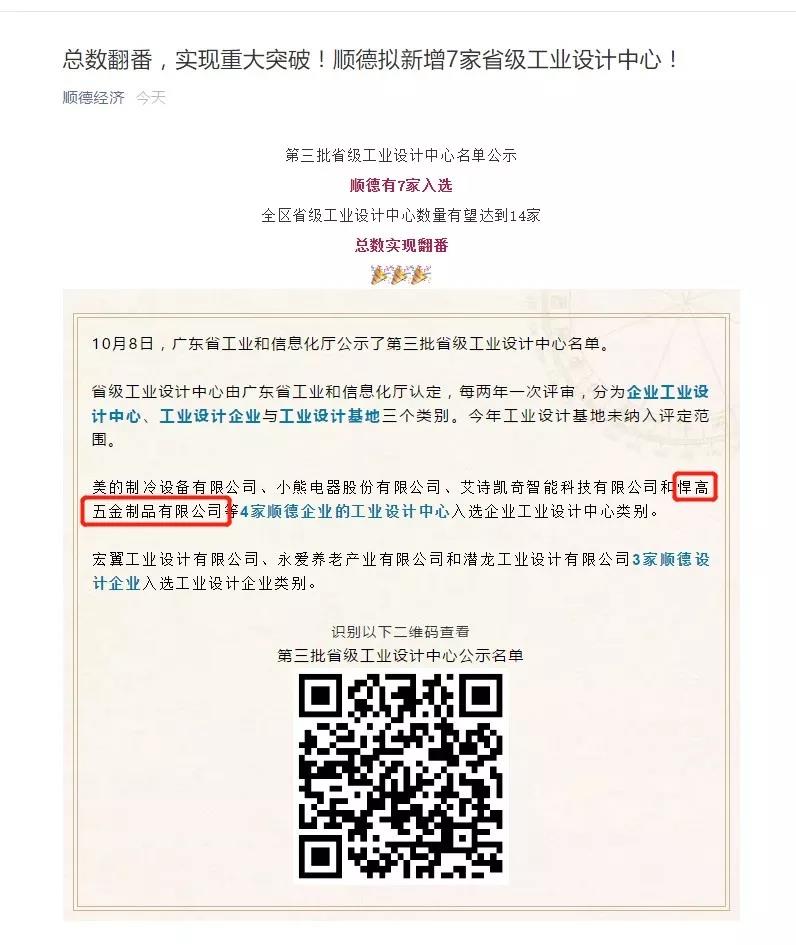 此次一起获评的还有美的制冷、小熊电器、艾诗凯奇等综合实力强劲的顺德企业。