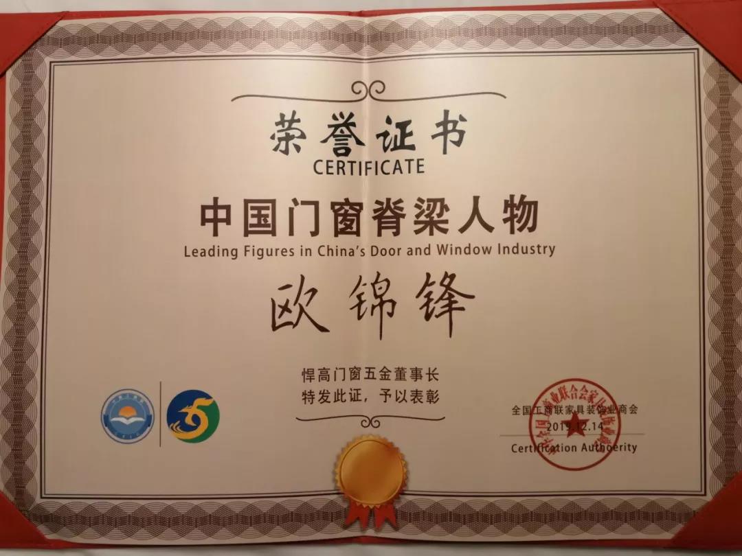 悍高集团董事长欧锦峰先生凭借其对门窗五金极致的品质追求与卓越的原创设计精神,荣膺门窗行业至高荣誉——中国门窗脊梁人物。