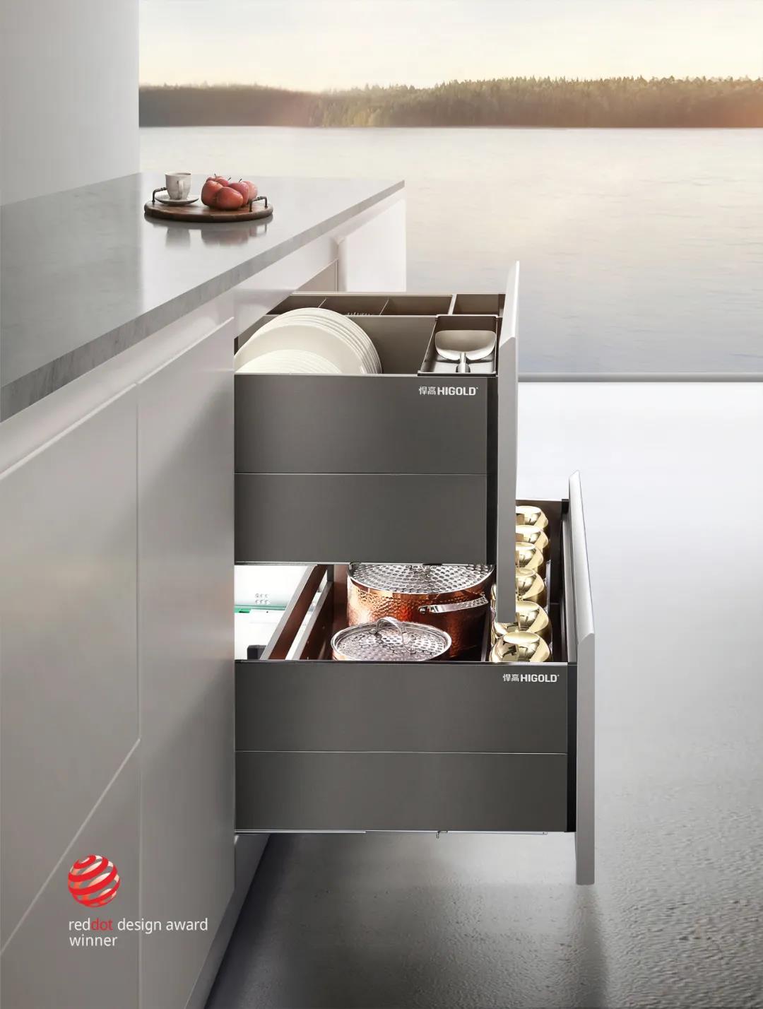 本次获奖的希勒4.0系列收纳拉篮,设计创意灵感来源于利用拉篮的空间,单层收纳变为多层收纳的设计理念,全面整体地提升了拉篮内空间的使用率。