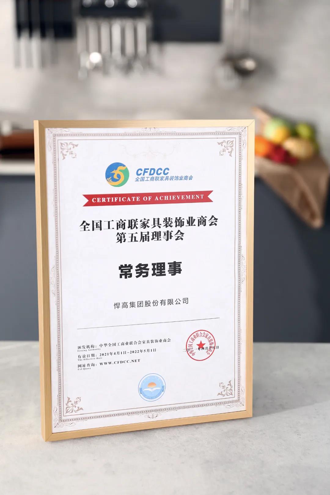 △悍高集团当选常务理事证书