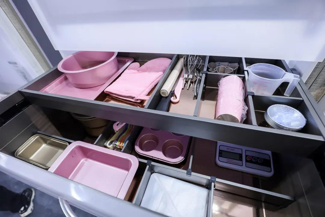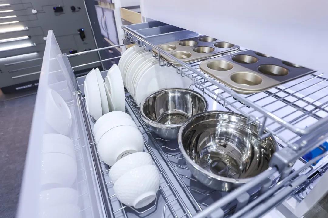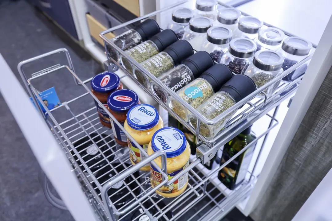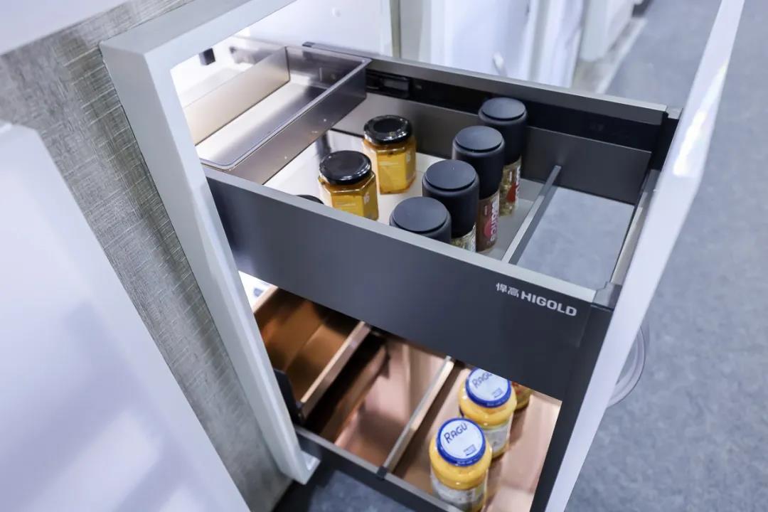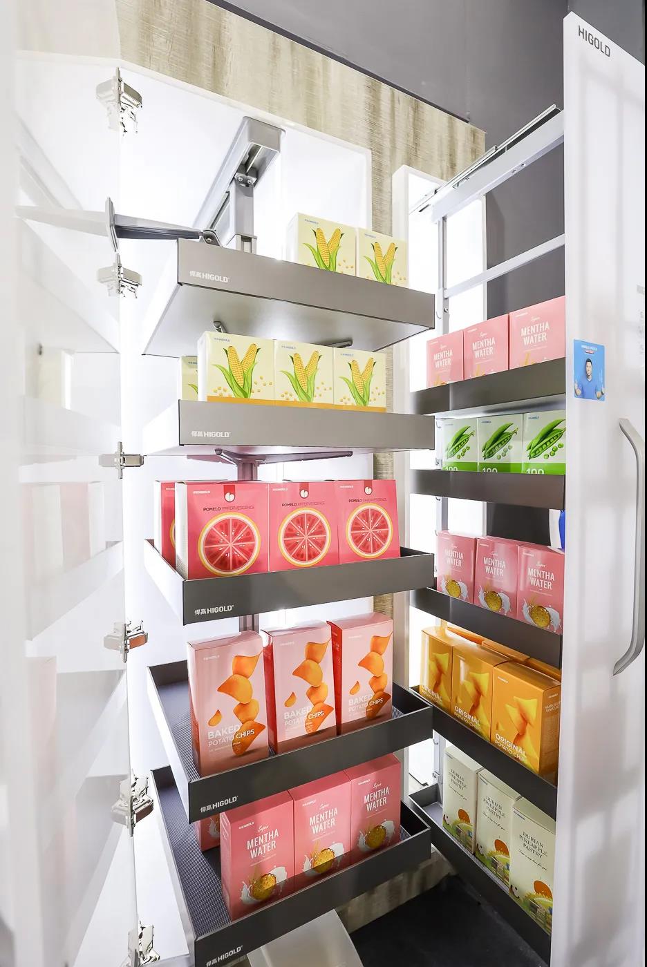 悍高五金展厅展示了多品类产品,实力展示产品力量。厨房收纳系列带来全新原创产品——星链系列,颠覆传统收纳延续马丁系列爆款基因,全新升级抽中抽,比传统橱柜多一层收纳,让收纳空间倍增。