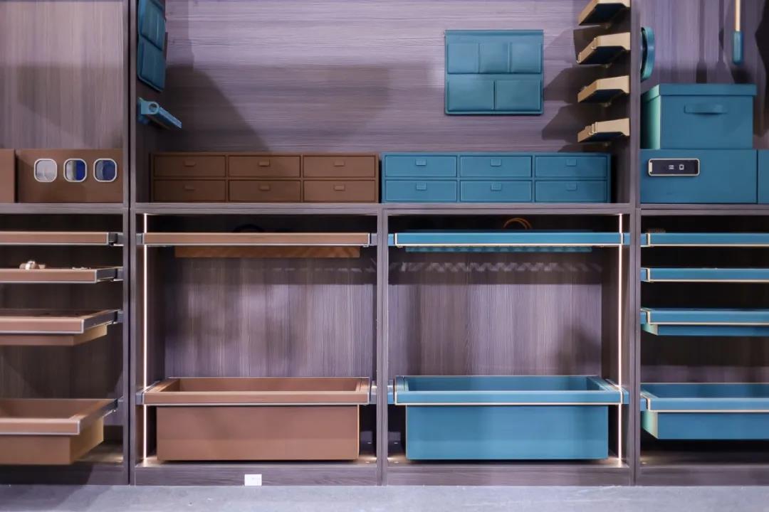 悍高五金展厅衣柜收纳系列惊艳新品——BV系列,全新摩登配色——莫兰绿与高级灰,低调矜贵尽显含蓄之美,重新定义家居美学,一改传统冰冷五金金属特性,触感更柔软更舒适,吸引众多观展者体验。