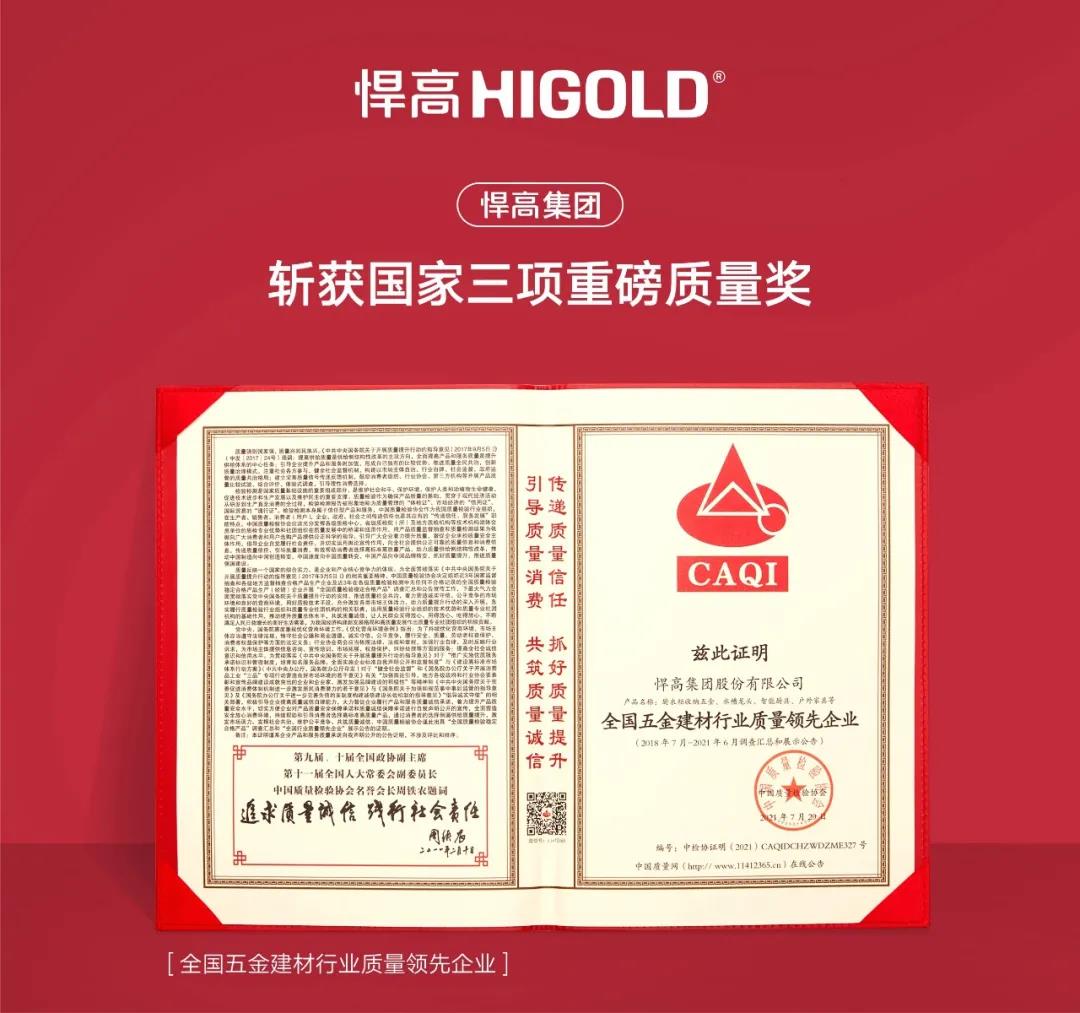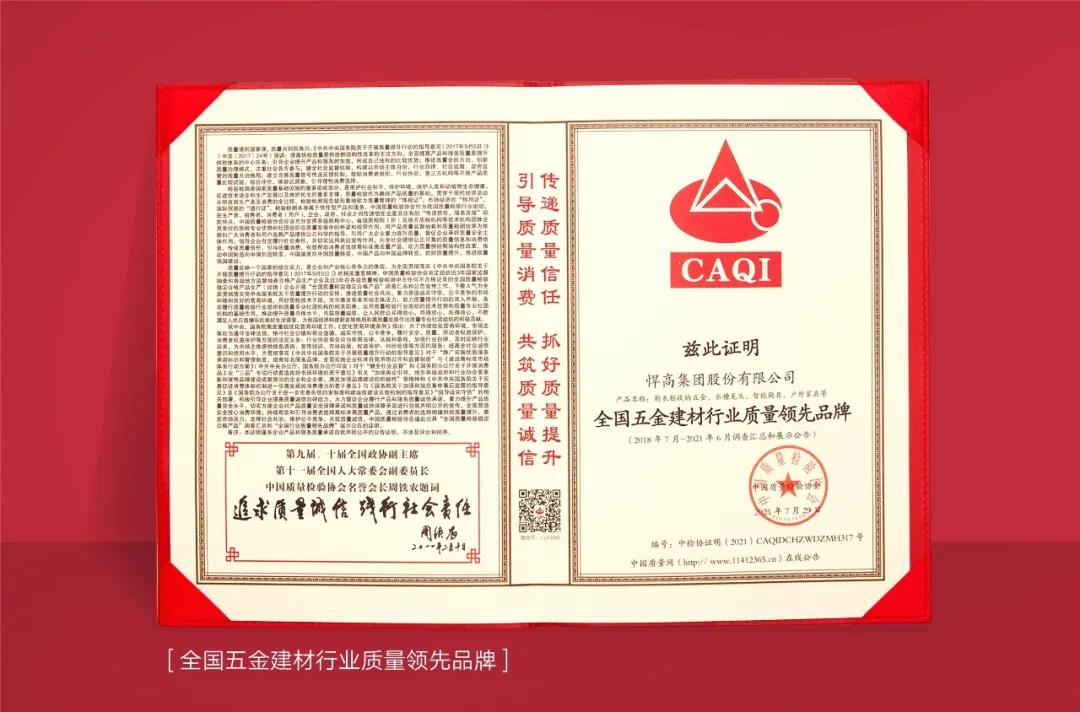 传递质量信任,引导质量消费。悍高集团继2021年年初荣获“全国质量检验稳定合格产品”等荣誉后,近日,悍高集团再度获得“全国五金建材行业质量领先企业”、“全国五金建材行业质量领先品牌”、“全国质量检验稳定合格产品”三项殊荣。