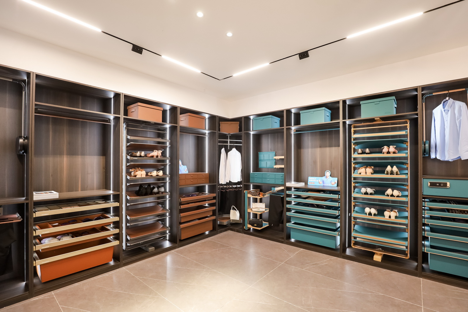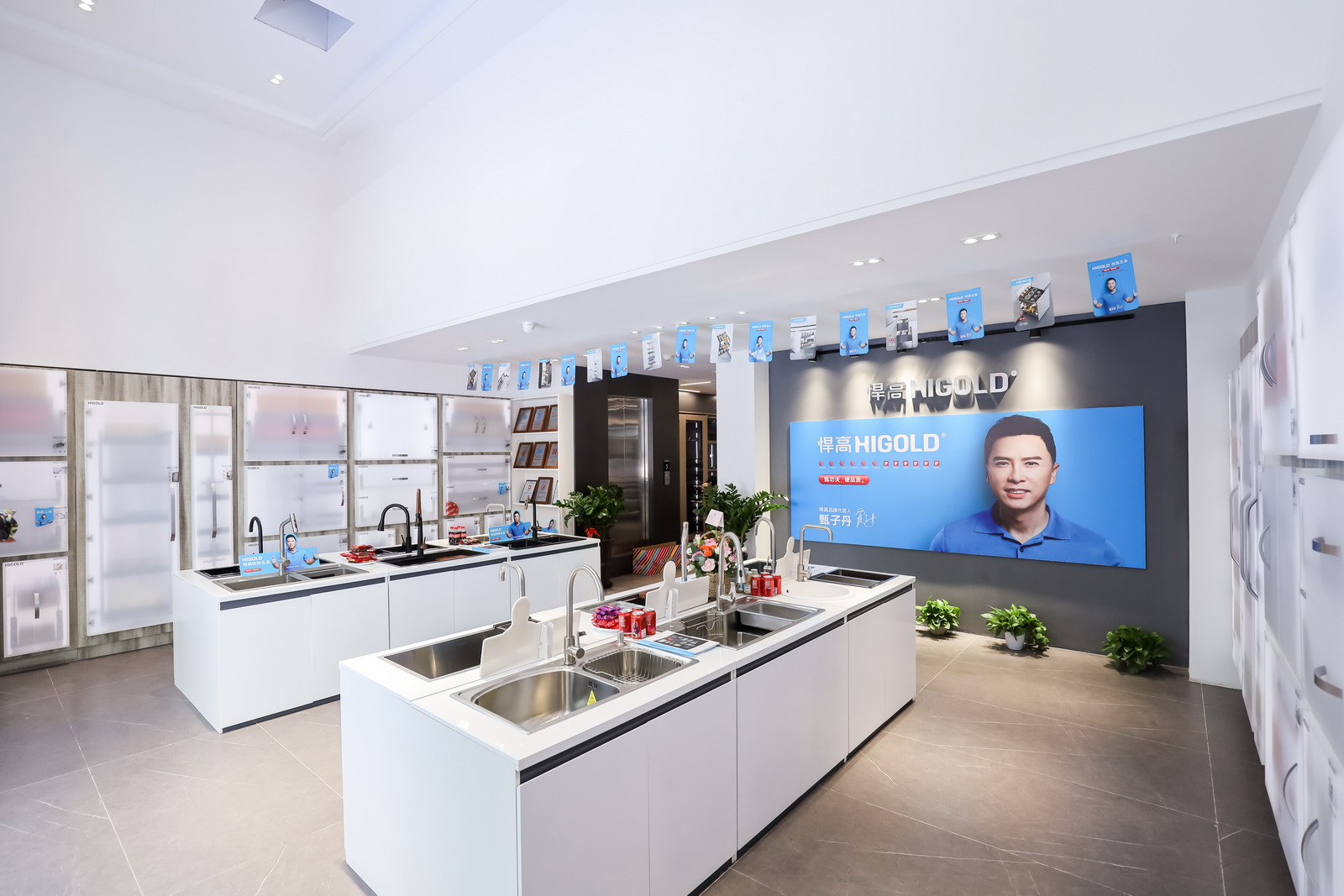 悍高台州旗舰店以打破传统展厅的刻板认知,融汇了时尚风格和流水动向的设计布局,从门头门面到展厅布局全方位给您一次升华的感受,呈现出了一个会说话的高颜值展厅,简约又兼备品味,整个展厅空间规划分为厨房功能五金、衣柜功能五金、基础五金、水槽龙头、智能厨电、装饰五金等,为您呈现一个安静舒适的一站式五金解决方案选品空间。
